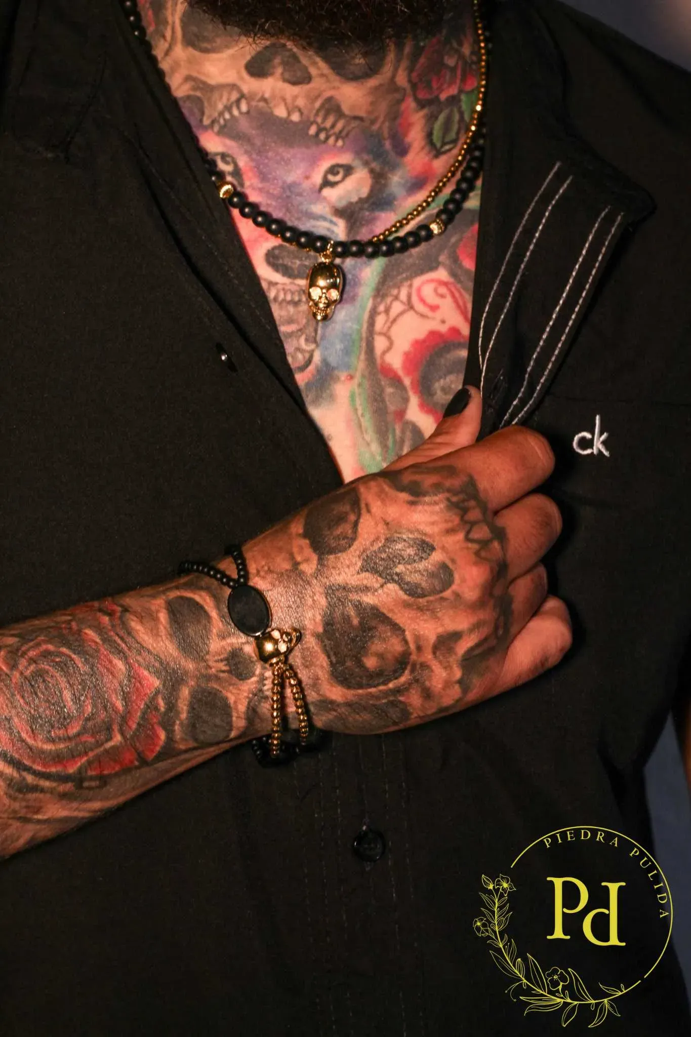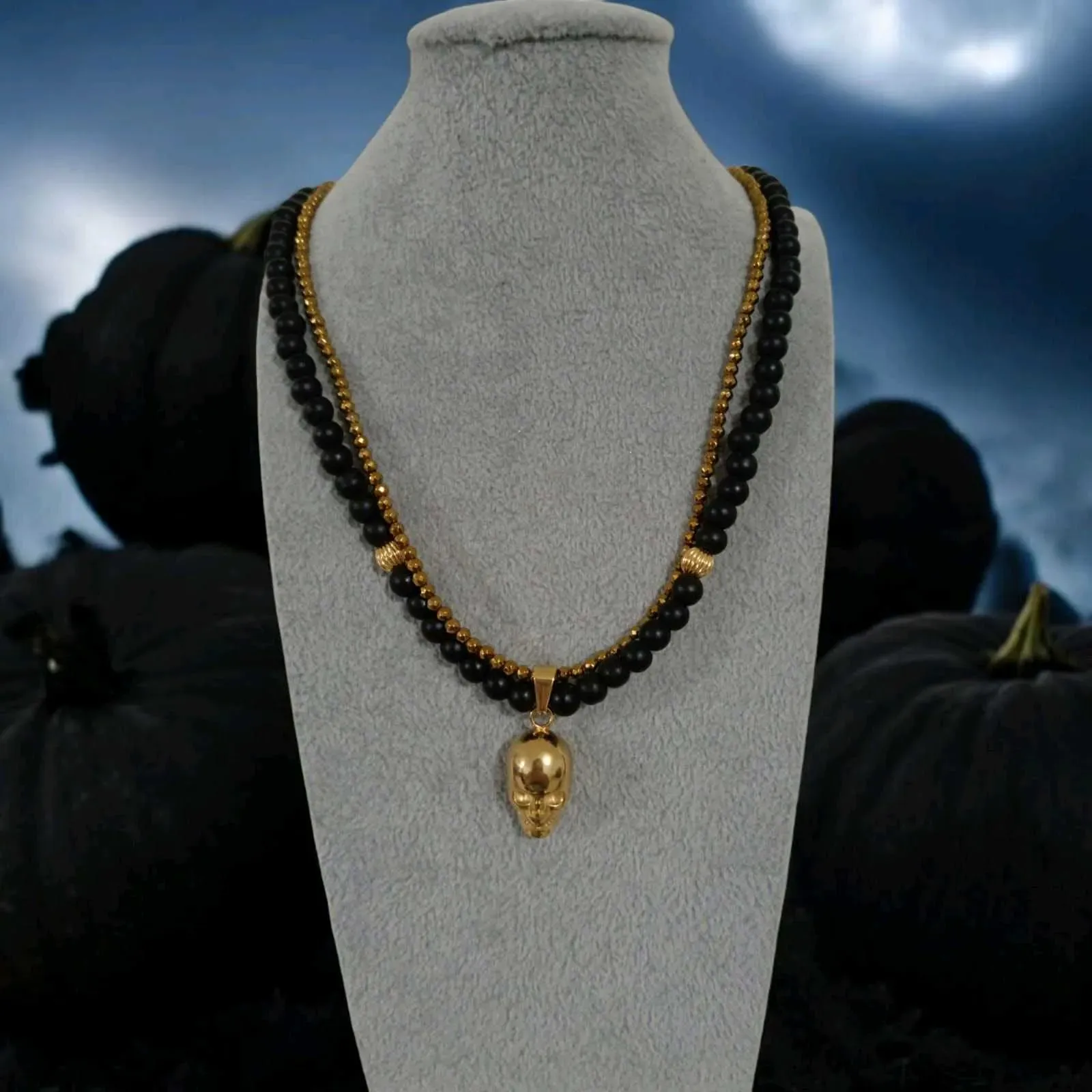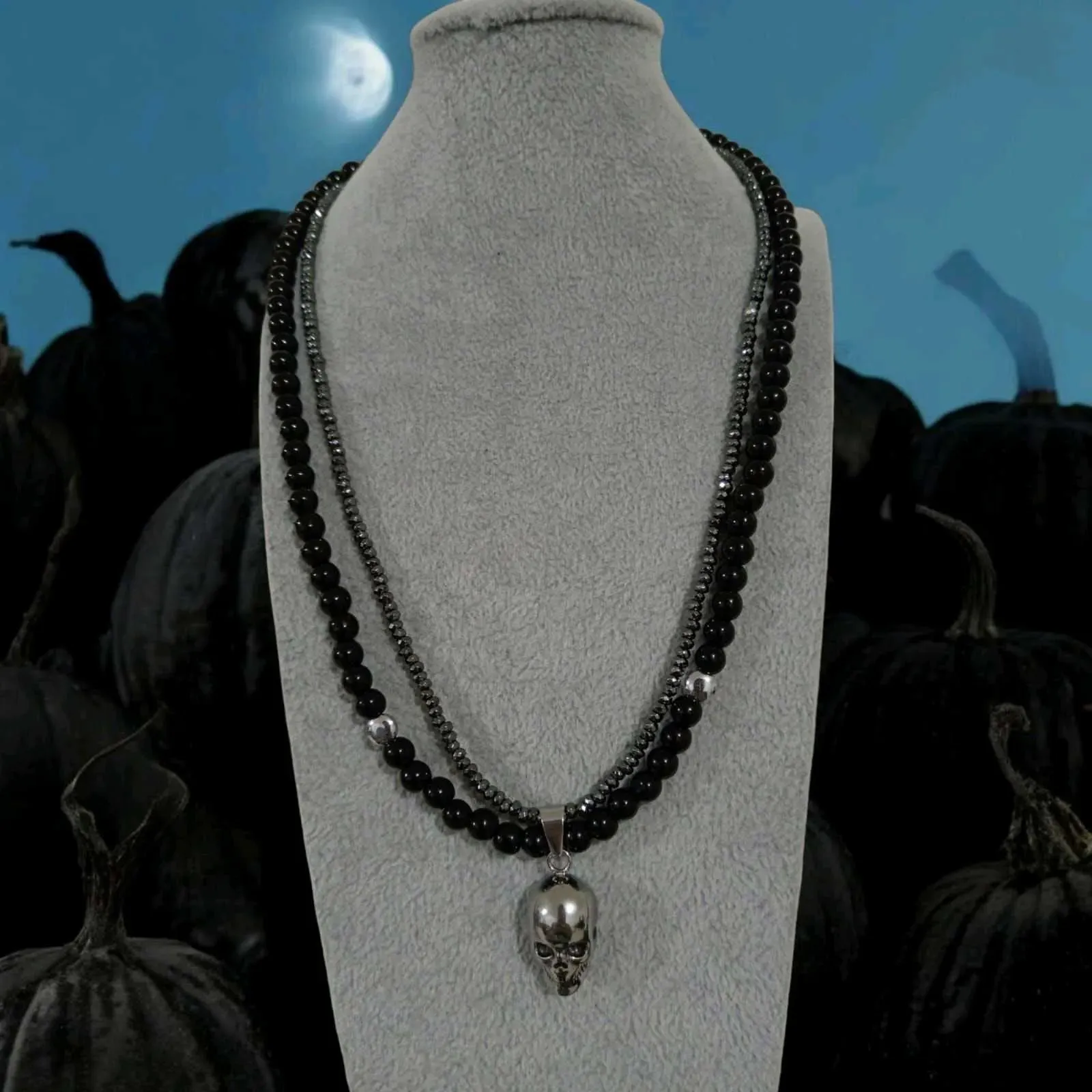 Collar de lujo ensamblado artesanalmente, cuentas micro con facetados especiales de un brillo espectacular, diseño doble hilo que produce un estilo único y moderno, cráneo de acero quirúrgico y cuentas naturales pulidas con intensidad. Una pieza de colección inolvidable.