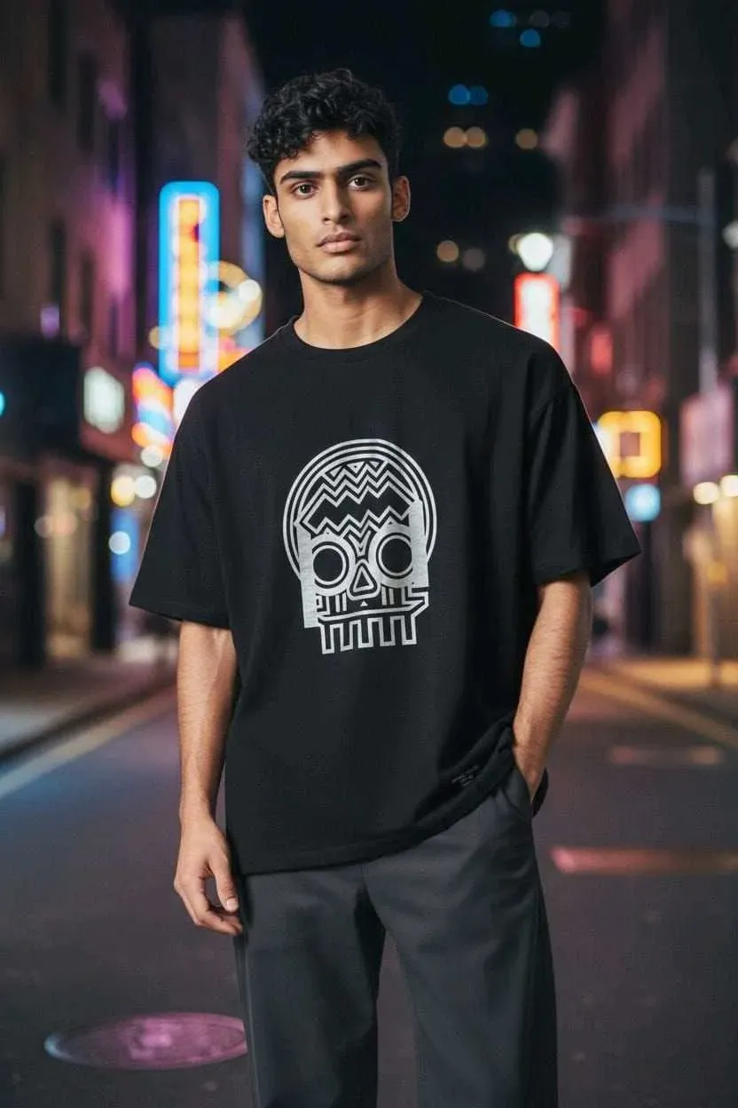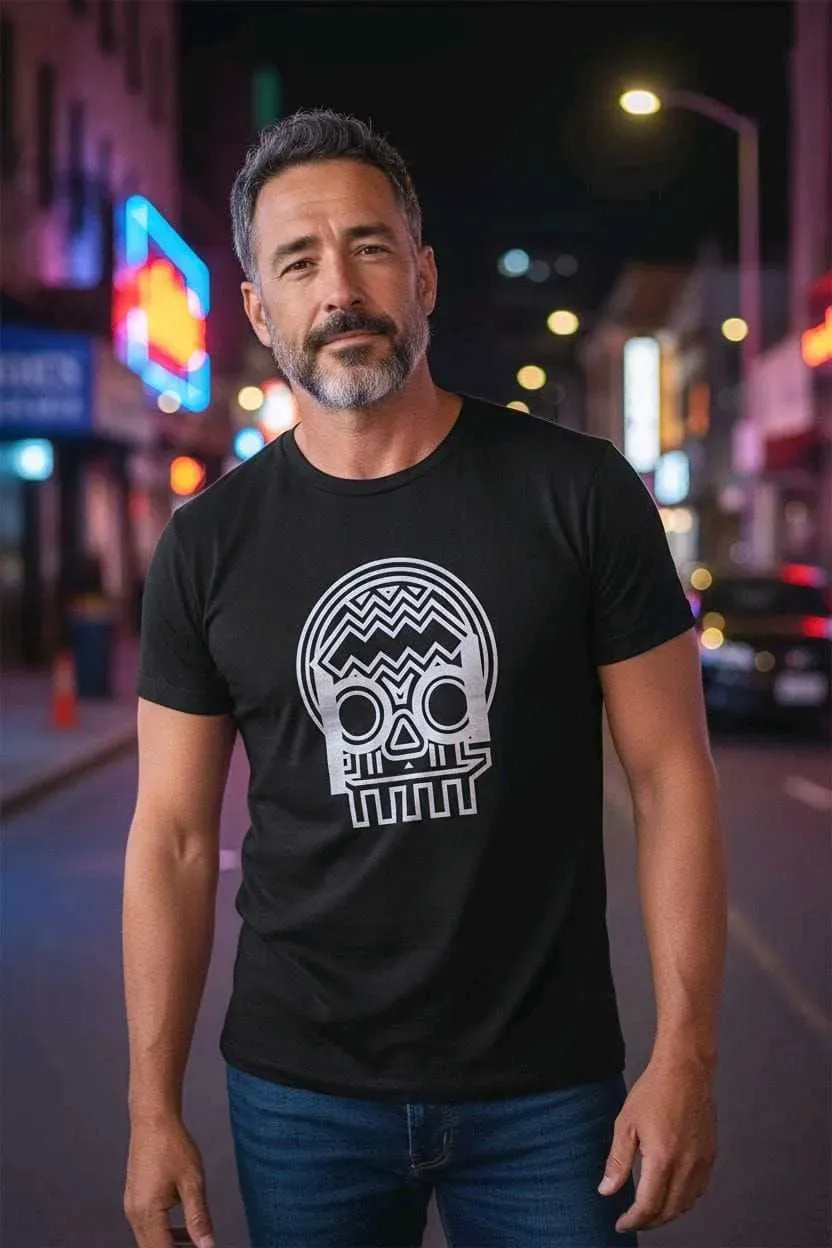 Playera de algodón negra con diseño de cráneo plateado, ideal para un estilo urbano y moderno. Fabricada con materiales de alta calidad que garantizan comodidad y durabilidad. Añade un toque de rebeldía a tu outfit con esta playera única.